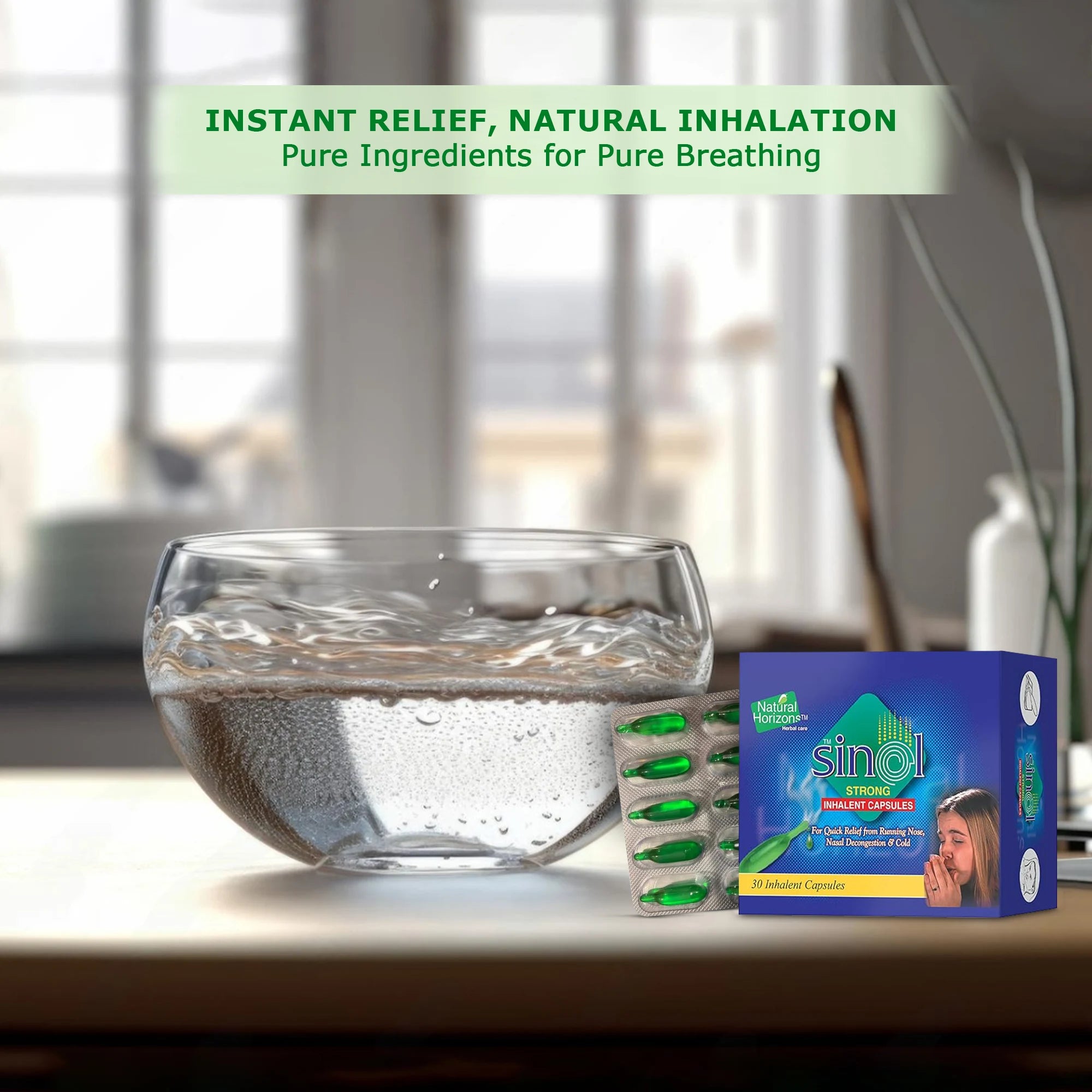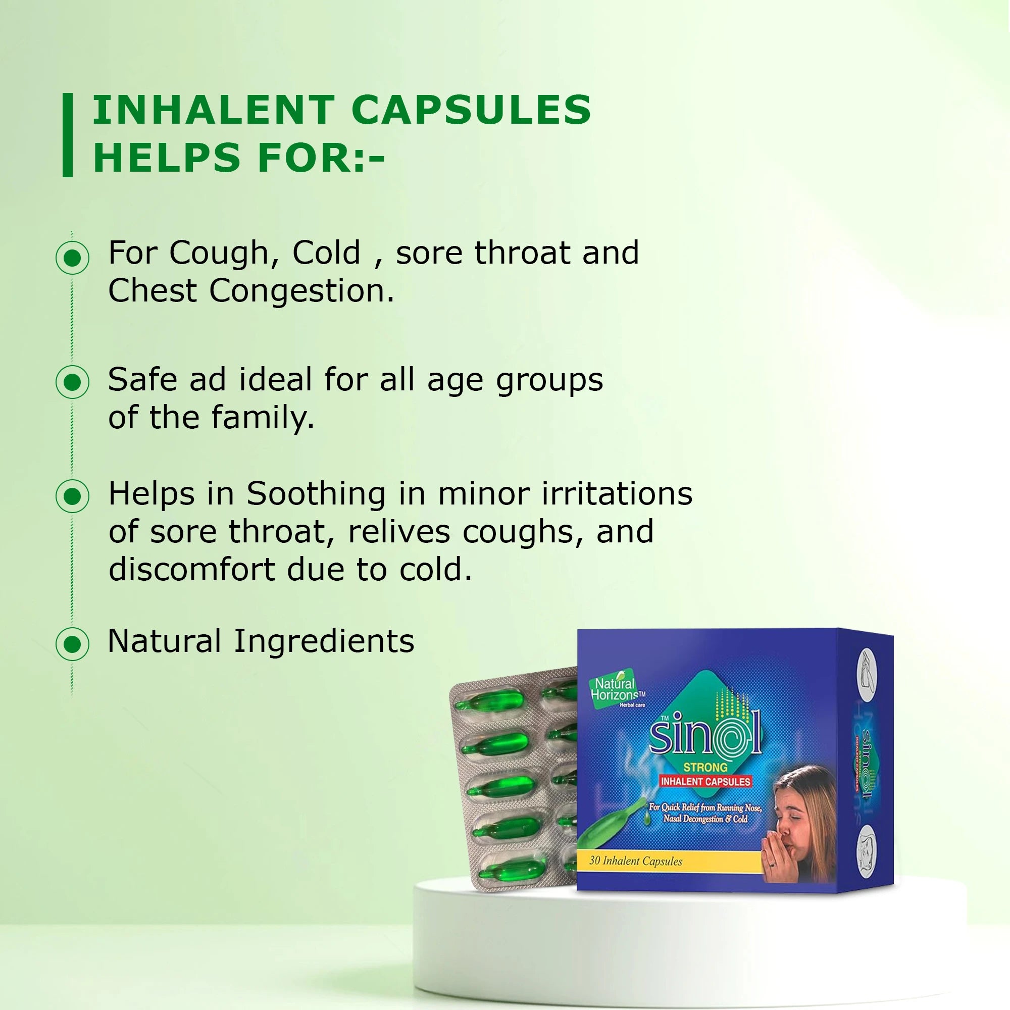 Natural Horizons Inhalent Capsules are designed to provide fast, natural relief from cold, cough, and nasal congestion. Made with pure and natural ingredients, these capsules release soothing vapors that ease breathing, relieve blocked or runny noses, and help clear chest congestion. Compact and easy to carry, they are perfect for use at home or on the go. Gentle yet effective, they are safe for all age groups and also provide comfort for minor throat irritations and cough-related discomforts.