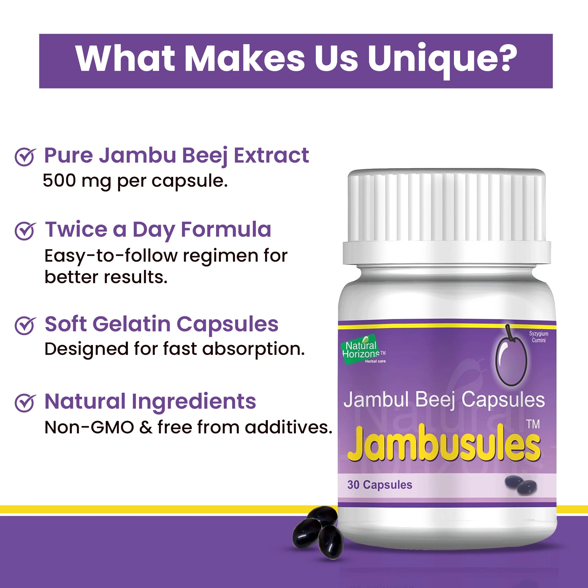 Natural Horizons Jambusules™ are premium-quality Jambul Beej (Syzygium cumini seed) capsules designed to support healthy blood sugar levels naturally. Traditionally valued in Ayurveda, Jambul Beej is known for its low glycaemic index and its ability to help manage diabetes. These capsules also work as a natural carminative and astringent, aiding in digestion and overall wellness. Each softgel is crafted to preserve the potency of the seed extract, offering a safe and convenient way to include this time-tested remedy in your daily routine.