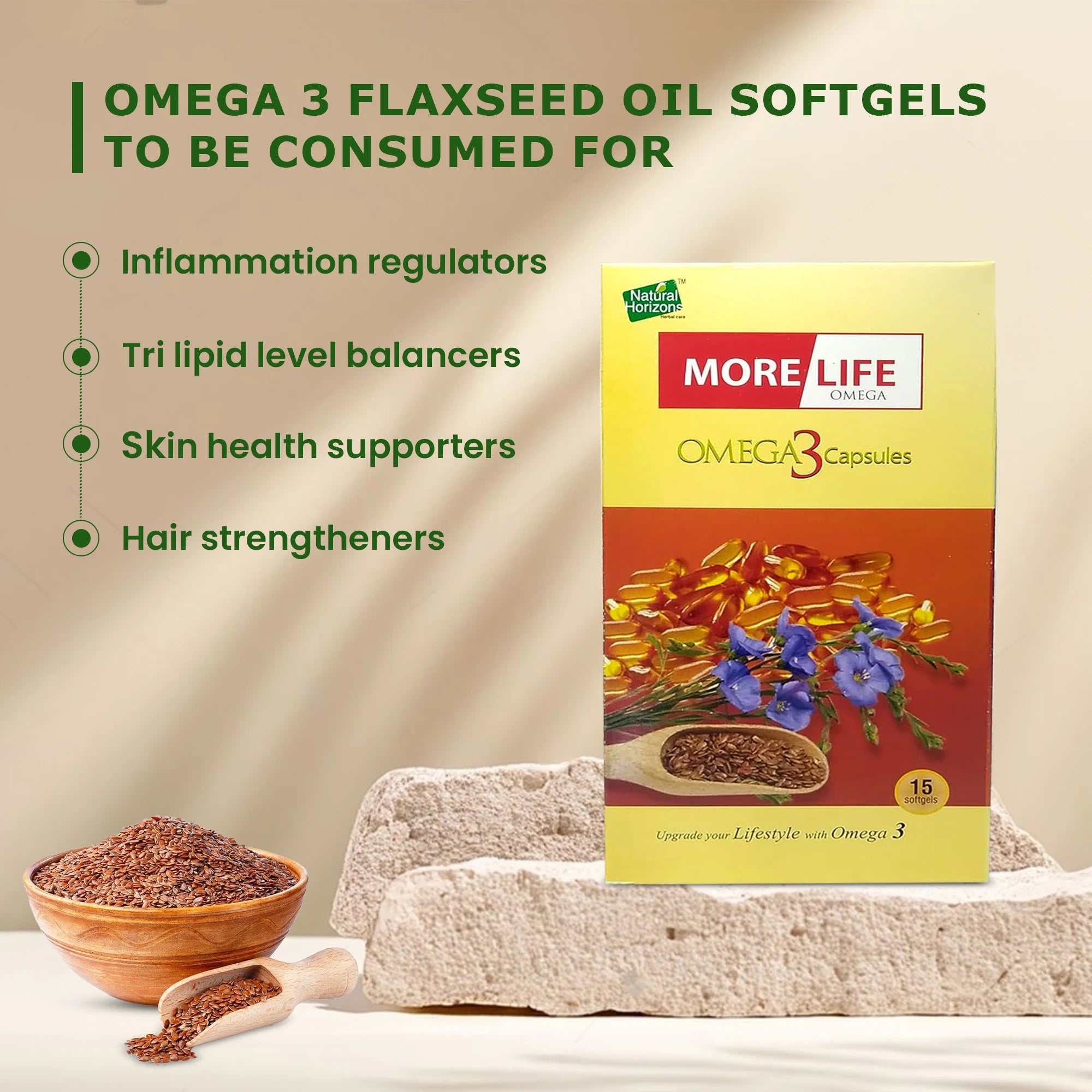 Natural Horizons More Life Omega 3 Flax Seed Oil Capsules combine the goodness of Flaxseed Oil and Wheat Germ Oil to deliver a powerful plant-based source of Omega-3 essential fatty acids. This unique formulation helps control inflammation, manage tri-lipid levels, and promote overall cardiovascular wellness. Enriched with Vitamin E and antioxidants from wheat germ oil, it supports collagen production for stronger skin, while also nourishing hair from within for natural shine and growth. A complete supplement for vitality, beauty, and joint health, More Life Omega is your daily step towards holistic well-being.